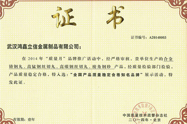 武漢鴻鑫立信金屬制品有限公司主要從事鋼丸、鋼絲切丸、鋼砂等除銹防腐耗材的生產(chǎn)和銷售。公司所有產(chǎn)品均通過ISO9001**質(zhì)量認(rèn)證,2014年更獲得了第三屆中國金屬磨料行業(yè)具有影響力品牌-華尊獎(jiǎng)。董事長陳群芝女士從事行業(yè)17年來專注為客戶節(jié)約鋼丸消耗成本,2014年獲得了華尊獎(jiǎng)-中國品牌建設(shè)實(shí)踐百名創(chuàng)新很好企業(yè)家的榮譽(yù)。服務(wù)過的國家建設(shè)項(xiàng)目有:北京鳥巢體育館、遼寧號(hào)航母、杭州灣跨海大橋、南海軍艦、成都雙流**機(jī)場(chǎng)、南車集團(tuán)動(dòng)車檢測(cè)中心、武漢火車站、武漢天興洲大橋等,同時(shí)服務(wù)的行業(yè)囊括橋梁制造、船舶制造、汽車制造、火車車輛制造、大理石打磨、鑄件清砂、各種機(jī)械制造表面清理等。鴻鑫鋼丸,值得信賴。